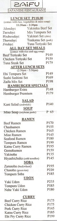 Revision as of 08:02, 29 January 2009 by Alumninet(talk | contribs)(New page: == Zaifu == * Address: P1 Level, Power Plant Mall, Rockwell Center, Makati City, Philippines * Tel No.: +63-2-898-1331 * Map: [http://wiki.alumni.net/wiki/Asia/Philippines/Metro_Manila/Mak...)
